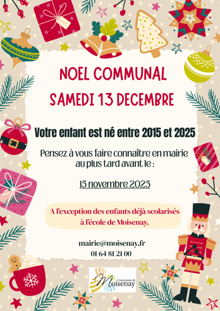 Si votre enfant est né entre 2015 et 2025 et qu’il n’est pas scolarisé à Moisenay il est nécessaire de vous faire connaître en mairie pour qu’il soit inscrit sur les listes dans le cadre du Noël communal